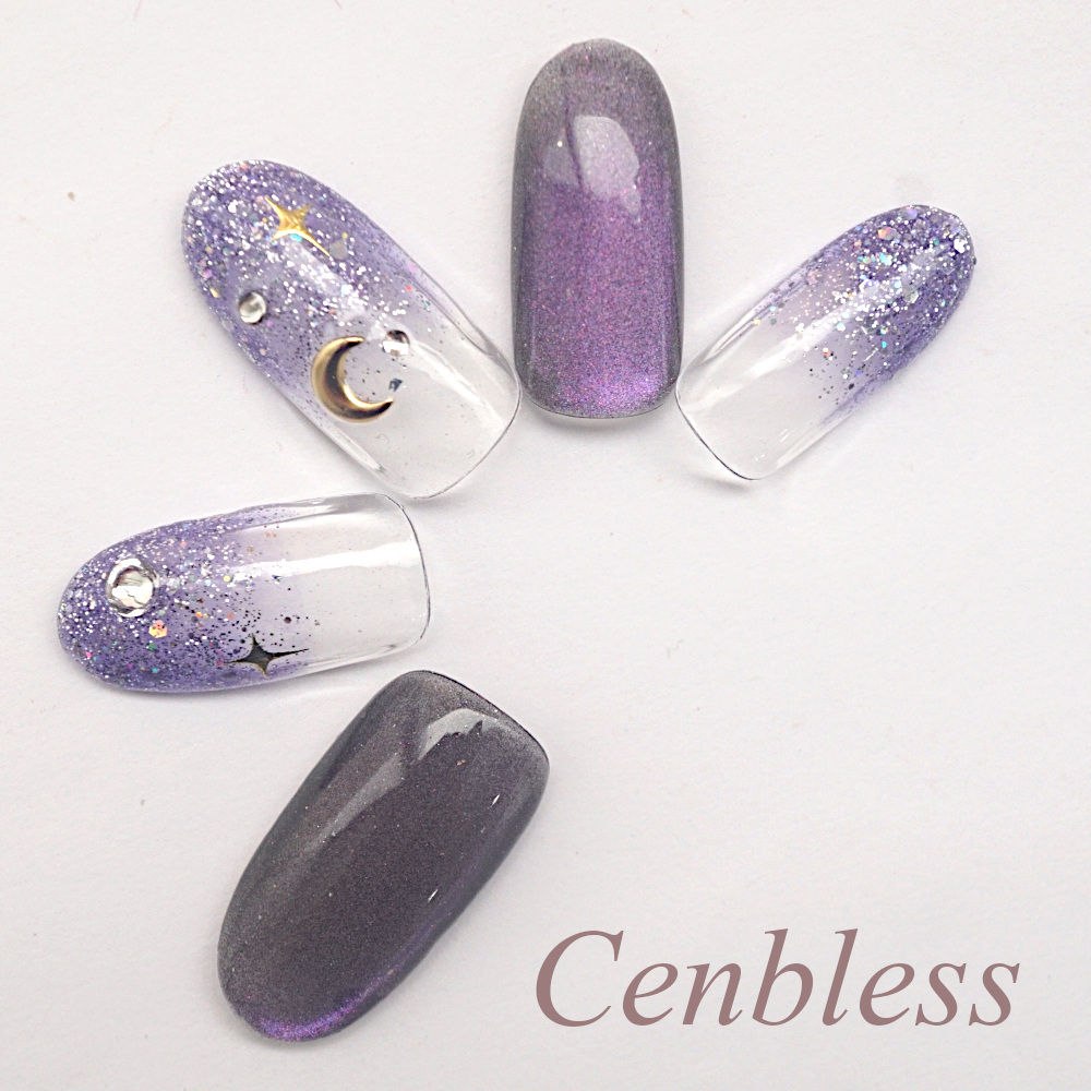 お選びいただいたのは、青みのあるパープルのラメグラデーション×パープル系プリズムキャッツアイに、月や光をモチーフにしたさりげないハロウィンデザイン。